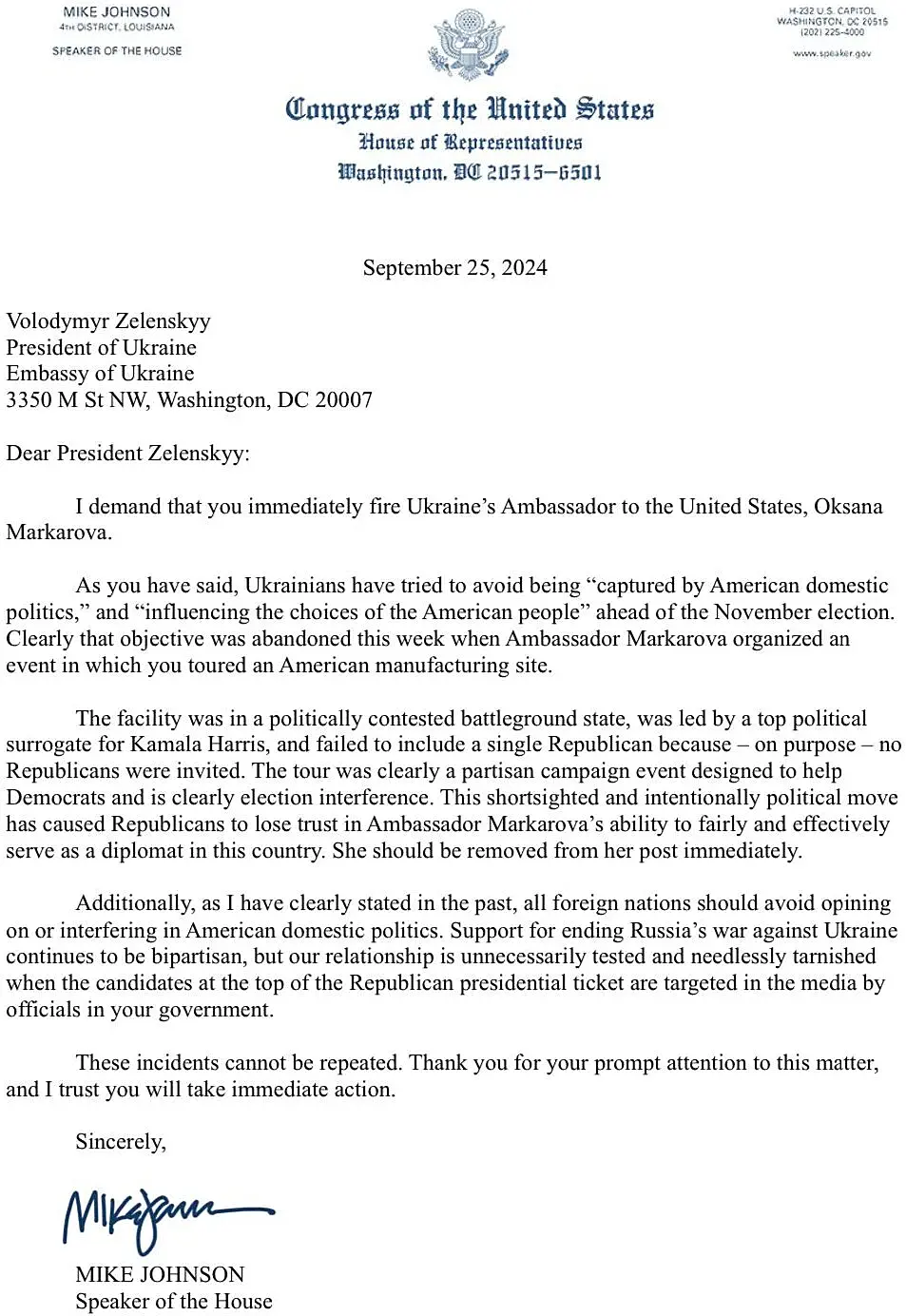 JUST IN: U.S. House Speaker Mike Johnson calls on Ukrainian President Volodymyr Zelenskyy to immediately FIRE Ukraine’s Ambassador to the U.S., Oksana Markarova.