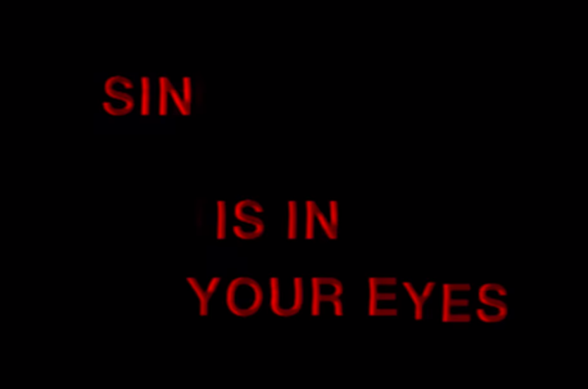 An old woman with a fucked up plastic surgery face, who appears just before the spliced-in frame reading “sin is in your eyes”: