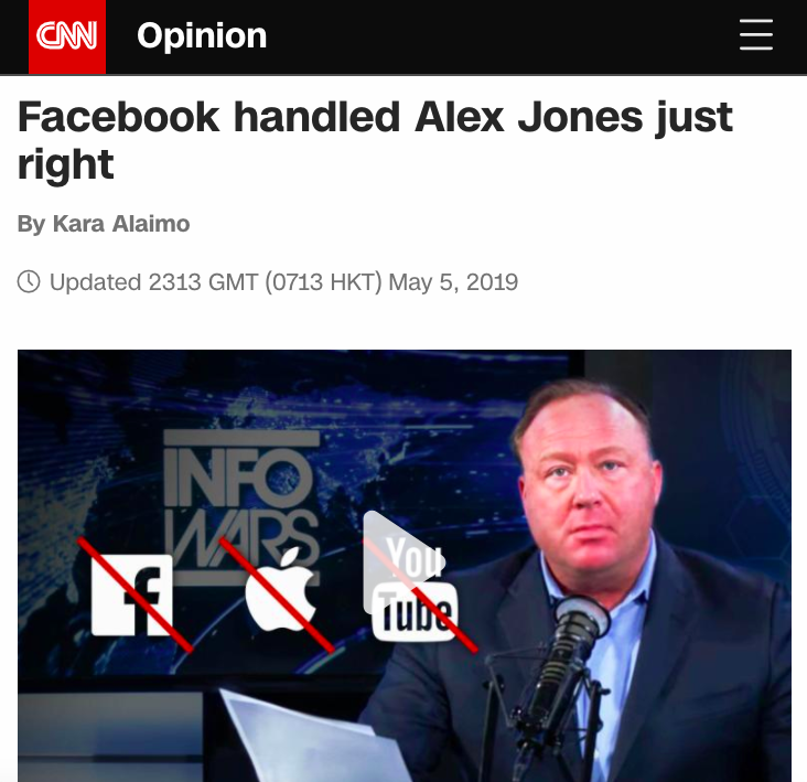 Of course, that was only possible because they had already shut me down. CNN basically said to Twitter, Facebook and YouTube: “this is just as bad as the Nazis you’ve already banned, so you’d better ban this too, or we’re just going to keep talking about how you support shooting kids at Sandy Hook.”