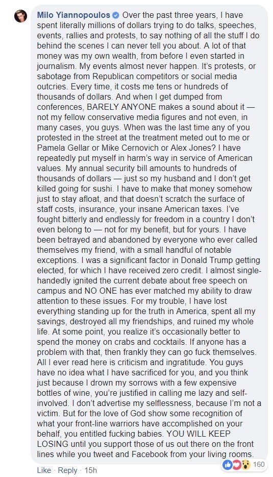 Milo – who is still around, remarkably – well, he has some choice words to share with his supporters.