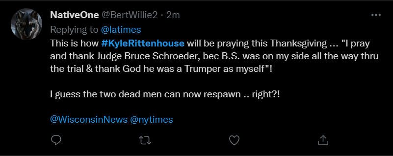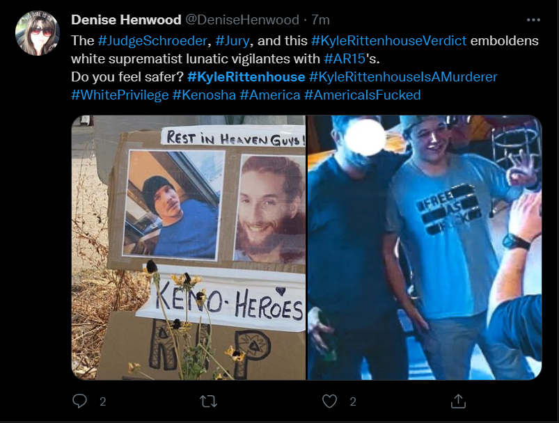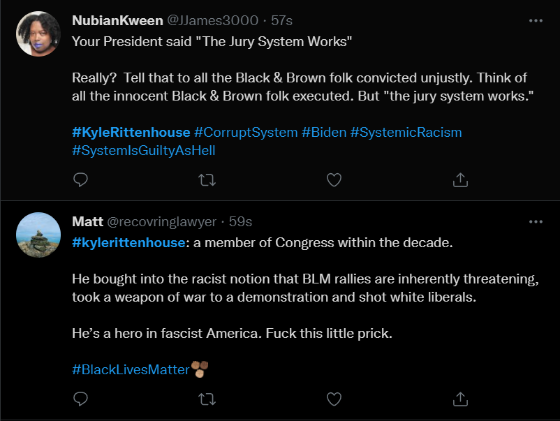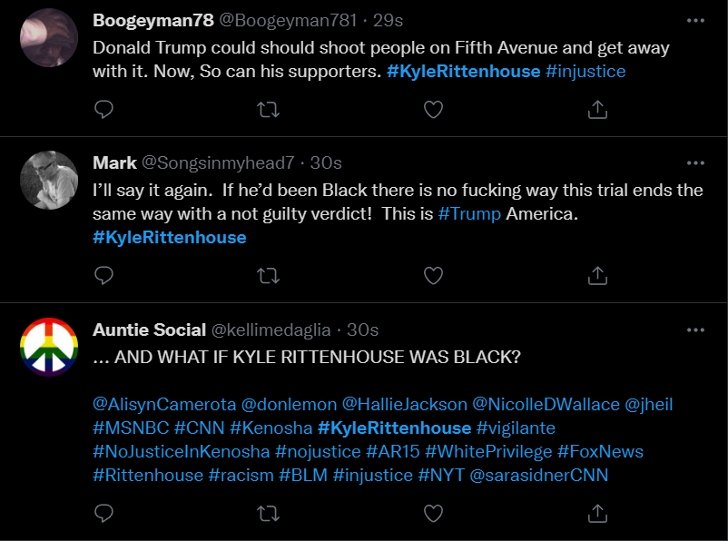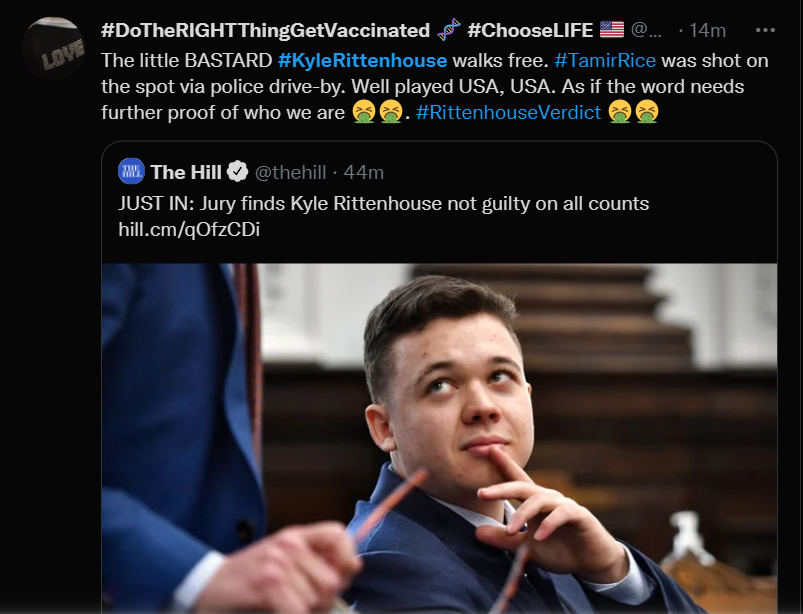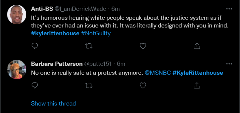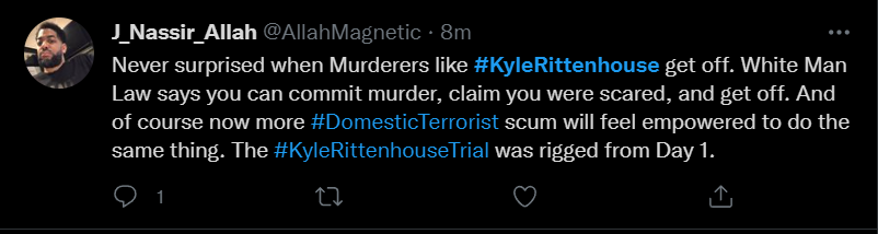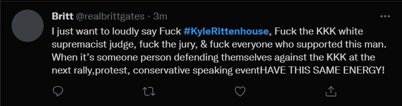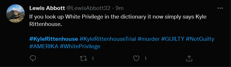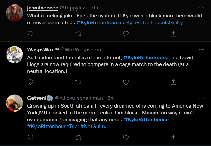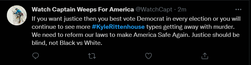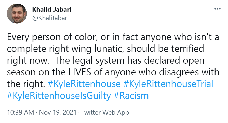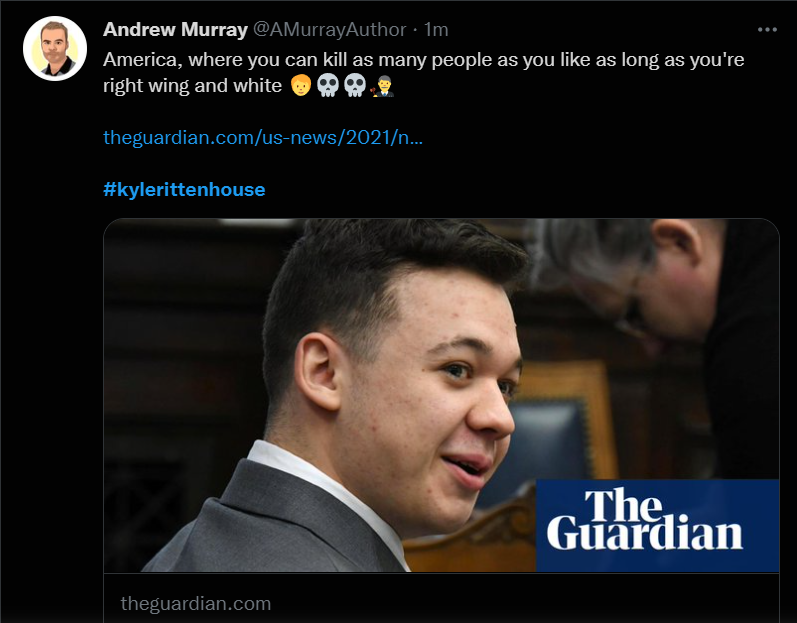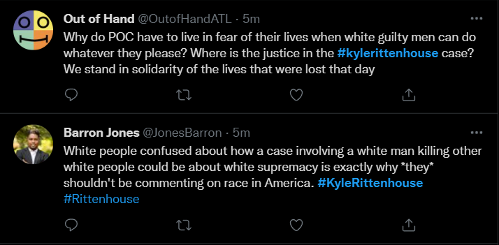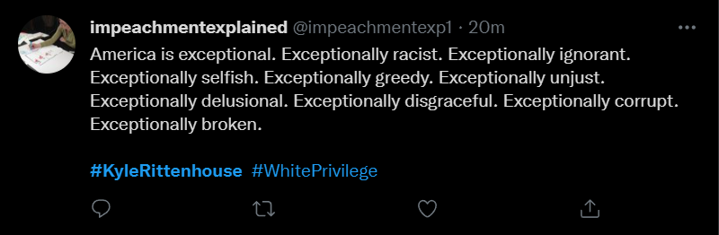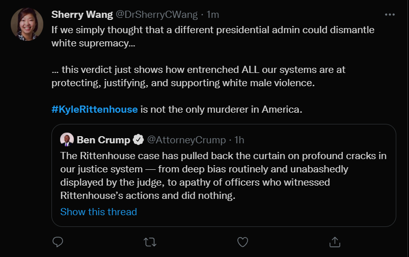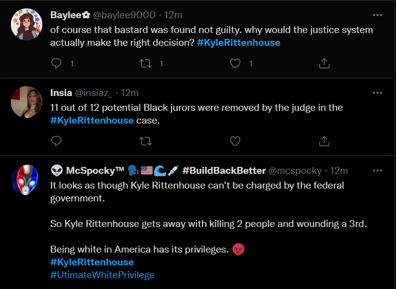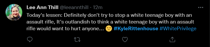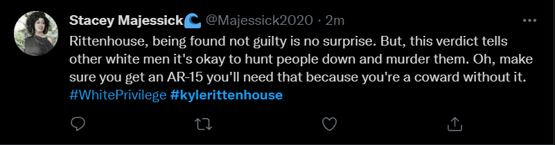 These people think that Kyle Rittenhouse was a white supremacist terrorist who showed up at a peaceful protest with an assault rifle and opened fire on a crowd, killing three blacks, and then the judge let him off because he is a white supremacist Trump supporter. The jury were all also white supremacists, and think black lives don’t matter. They hate the color of the skin of the blacks that Kyle murdered.