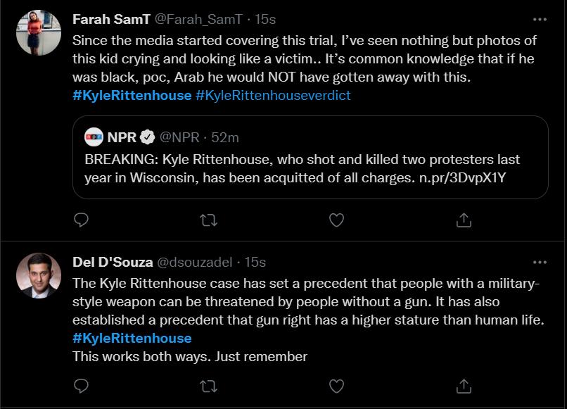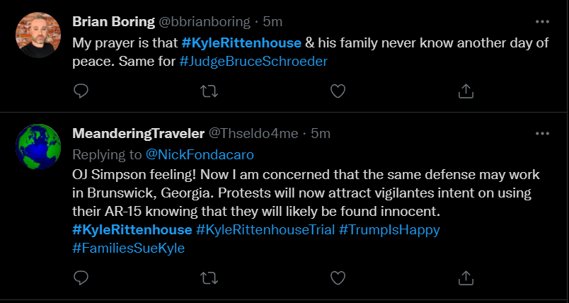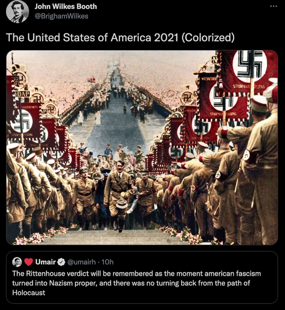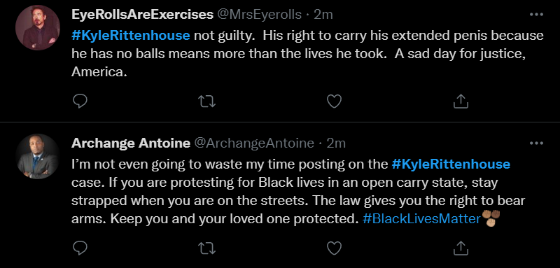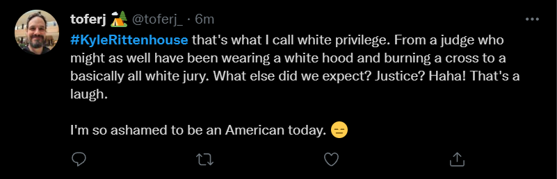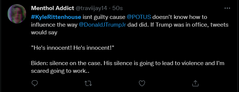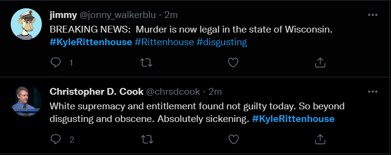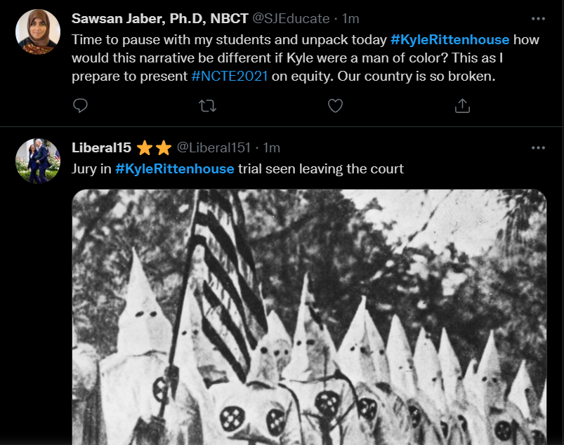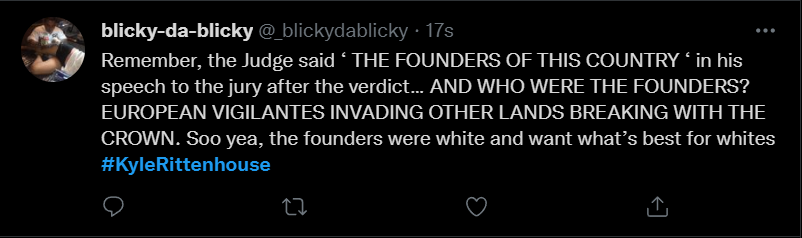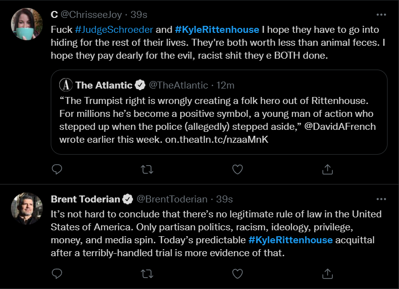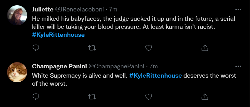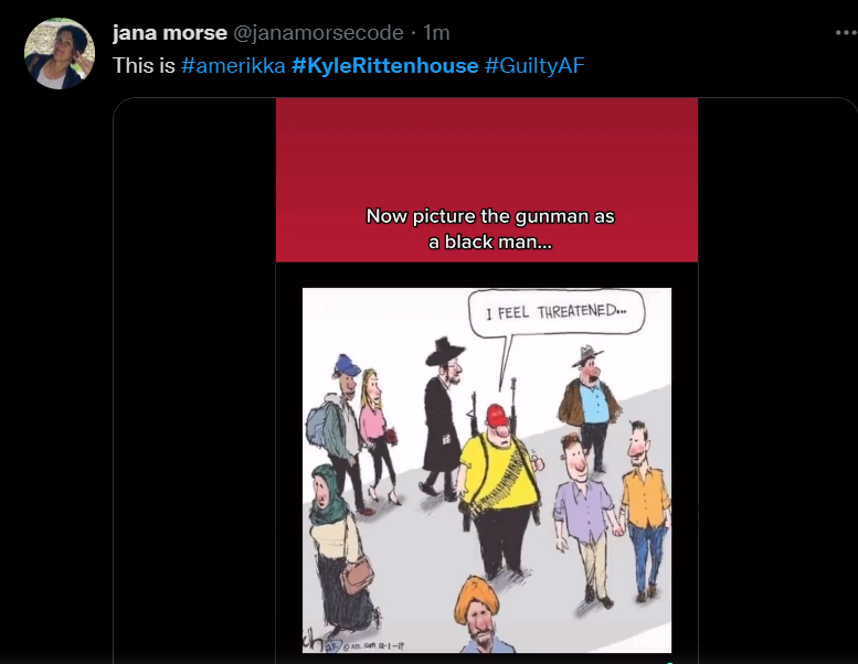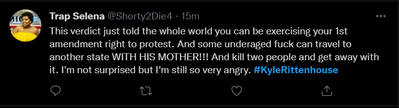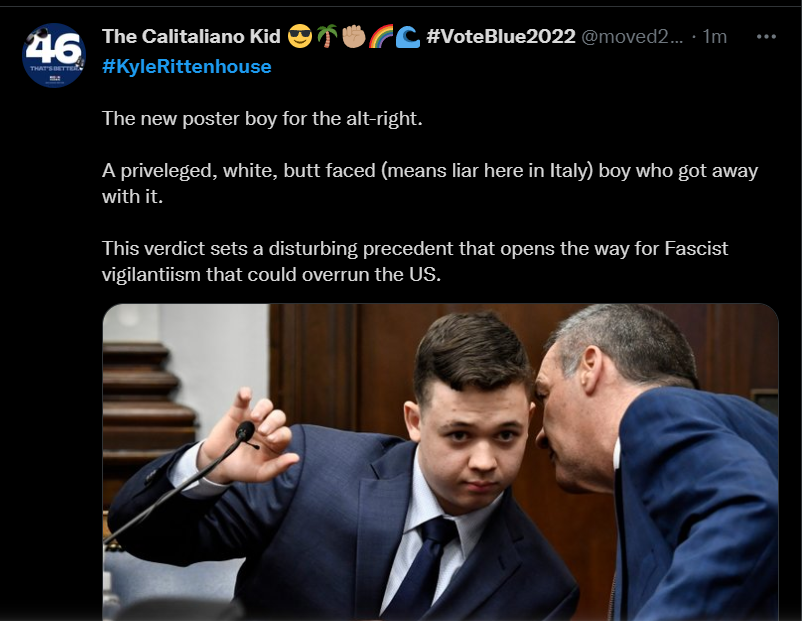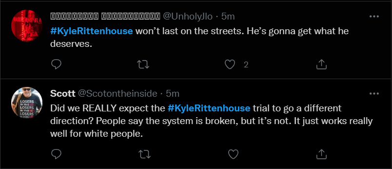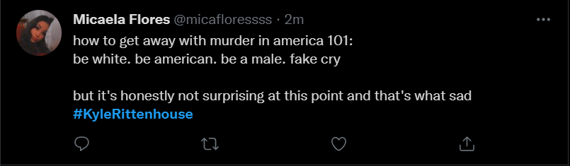 These people think that Kyle Rittenhouse was a white supremacist terrorist who showed up at a peaceful protest with an assault rifle and opened fire on a crowd, killing three blacks, and then the judge let him off because he is a white supremacist Trump supporter. The jury were all also white supremacists, and think black lives don’t matter. They hate the color of the skin of the blacks that Kyle murdered.