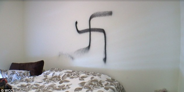 The racist vandals also ransacked the families belongings during the break-in and spray painted their televisions, a new couch and family photos.