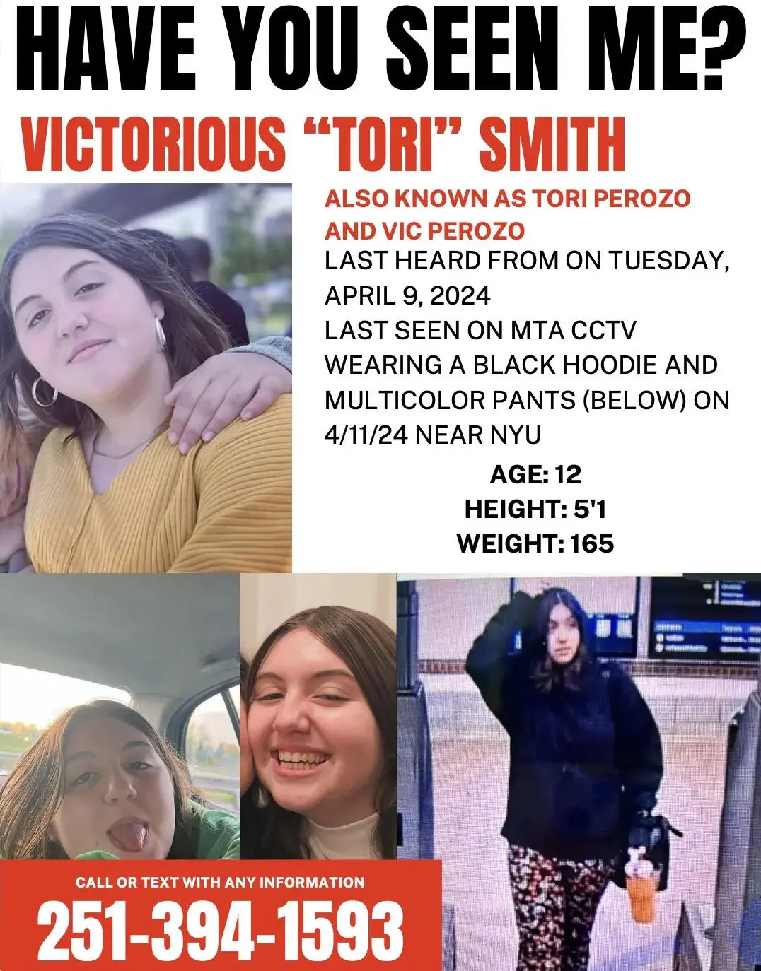 Tori was reported missing by her sister Eliana Perozo after an AirTag attached to her keys showed the pre-teen heading into Manhattan instead of back home to Prospect Lefferts Gardens after she finished classes at The Baccalaureate School for Global Education.