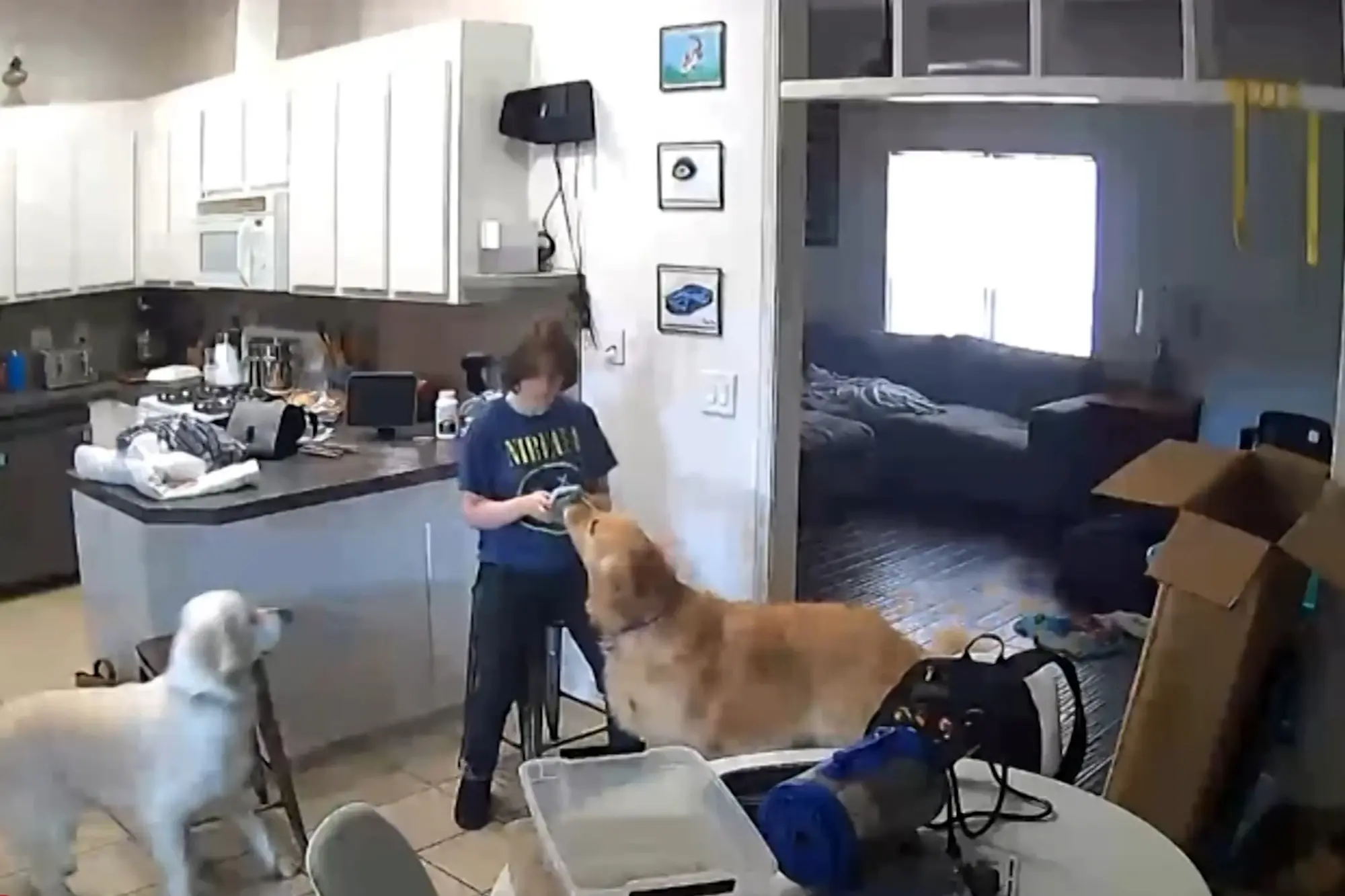 Gregg returned to the kitchen 10 seconds after the alleged shooting, again hiding the weapon, as she grabbed her mother’s phone off the counter and sat on a stool as the two dogs stood beside her.