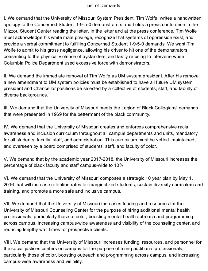 Here is the list of demands they formulated and presented on October 23rd. It even contains a non-ironic reference to “White male privilege” – that meme is burning out fast, huh?