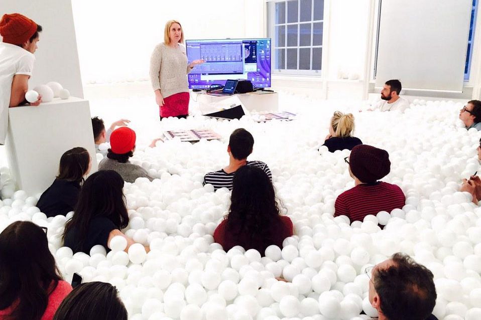 Containers, such as inflatable swimming pools, are filled with small plastic balls labeled with different topics and questions. Students are then encouraged to enter into the tubs together to discuss.