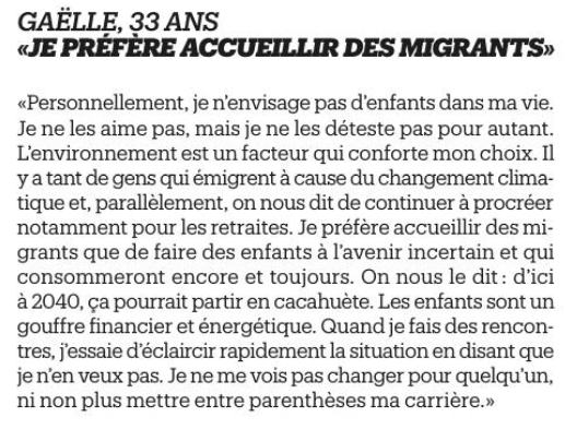 Personally, I don’t plan to have children in my life. I don’t like them but I don’t detest them either. The environment is a factor that reassures me about my choice. There are so many people emigrating because of climate change and, in parallel, they tell us that we need to continue to procreate, particularly for retired people. I prefer to welcome migrants than to have children with an uncertain future who will go on consuming ever more. They tell us: between now and 2040 it could all fall apart. Children are a chasm for finance and energy. When I meet people, I try to make the situation clear quickly by saying I don’t want them. I don’t see myself changing for anyone, nor putting my career in parentheses.