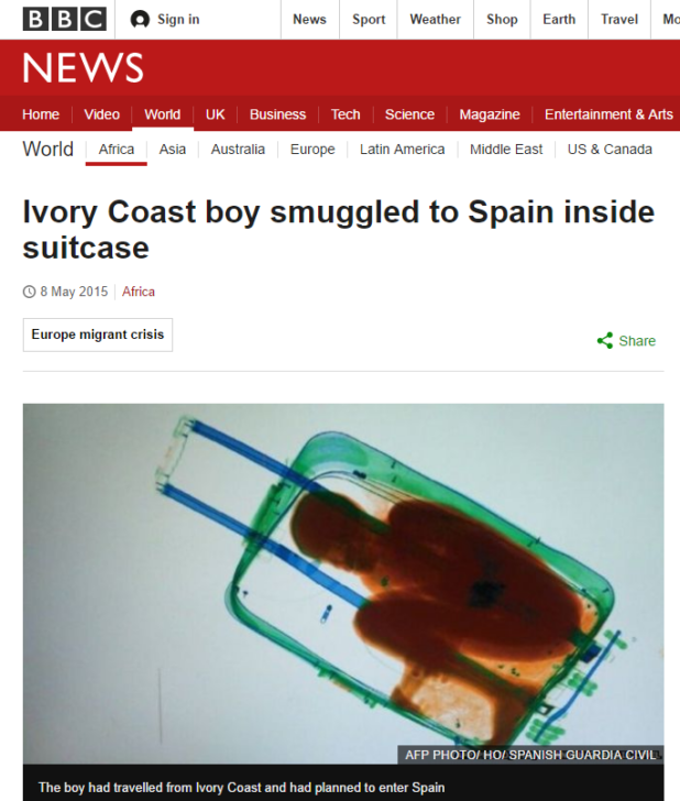 In 2015, an African boy from the Ivory Coast was stuffed in a suitcase in order to smuggle him into Europe.