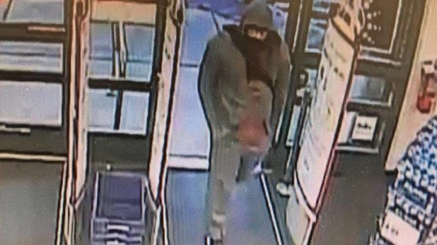 The suspect wore an olive green hooded sweatshirt with a red design on the front, his sneakers were white and black and he wore a cloth that partially covered is lower face.