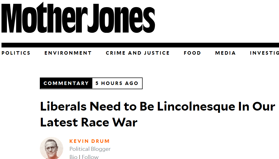 A few years ago, Drum claimed anti-white bias was a myth. Now he openly admits he is waging a race war against them. This is progress of some kind, even if it is only towards honesty.