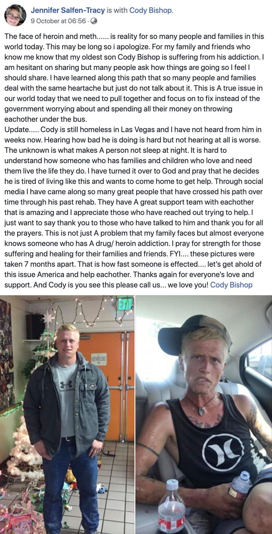 Like many before and after pictures, the images Jennifer Salfen-Tracy shared on social media show a stark difference. But the mother’s photos are especially tragic: They show the heartbreaking devastation of addiction on her oldest son, Cody Bishop.
