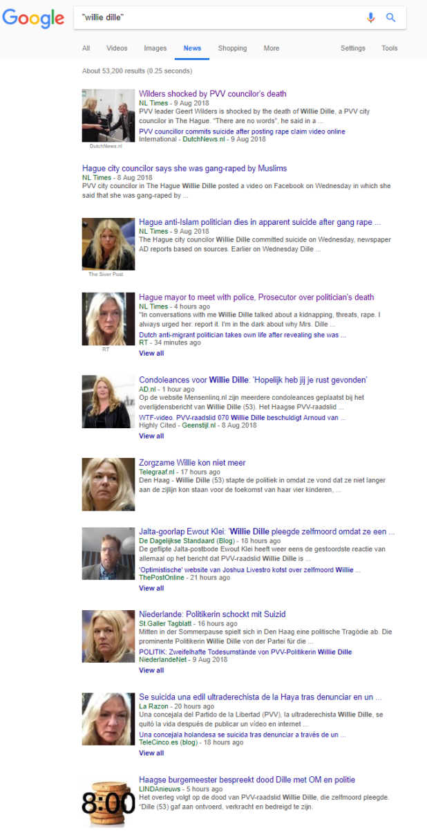 Scanning Google news results today, the story of Dutch politician Willie Dille‘s suicide seems to have been completely blanked out by mainstream English-language news organisations. Shortly before committing suicide, she claimed, in a video, that she had been kidnapped and gang-raped by Muslims and that the whole thing had been arranged by Arnoud van Doorn. Like Dille, Arnoud van Doorn had been a member of Geert Wilders’ anti-Islam party, the PVV. Bizarrely, however, Van Doorn left the party and converted to Islam.