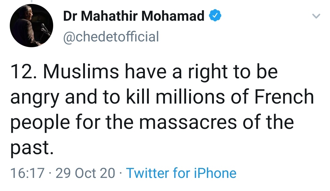 “But irrespective of the religion professed, angry people kill. The French in the course of their history has [sic] killed millions of people. Many were Muslims,” Mohamad wrote before he posted the tweet.