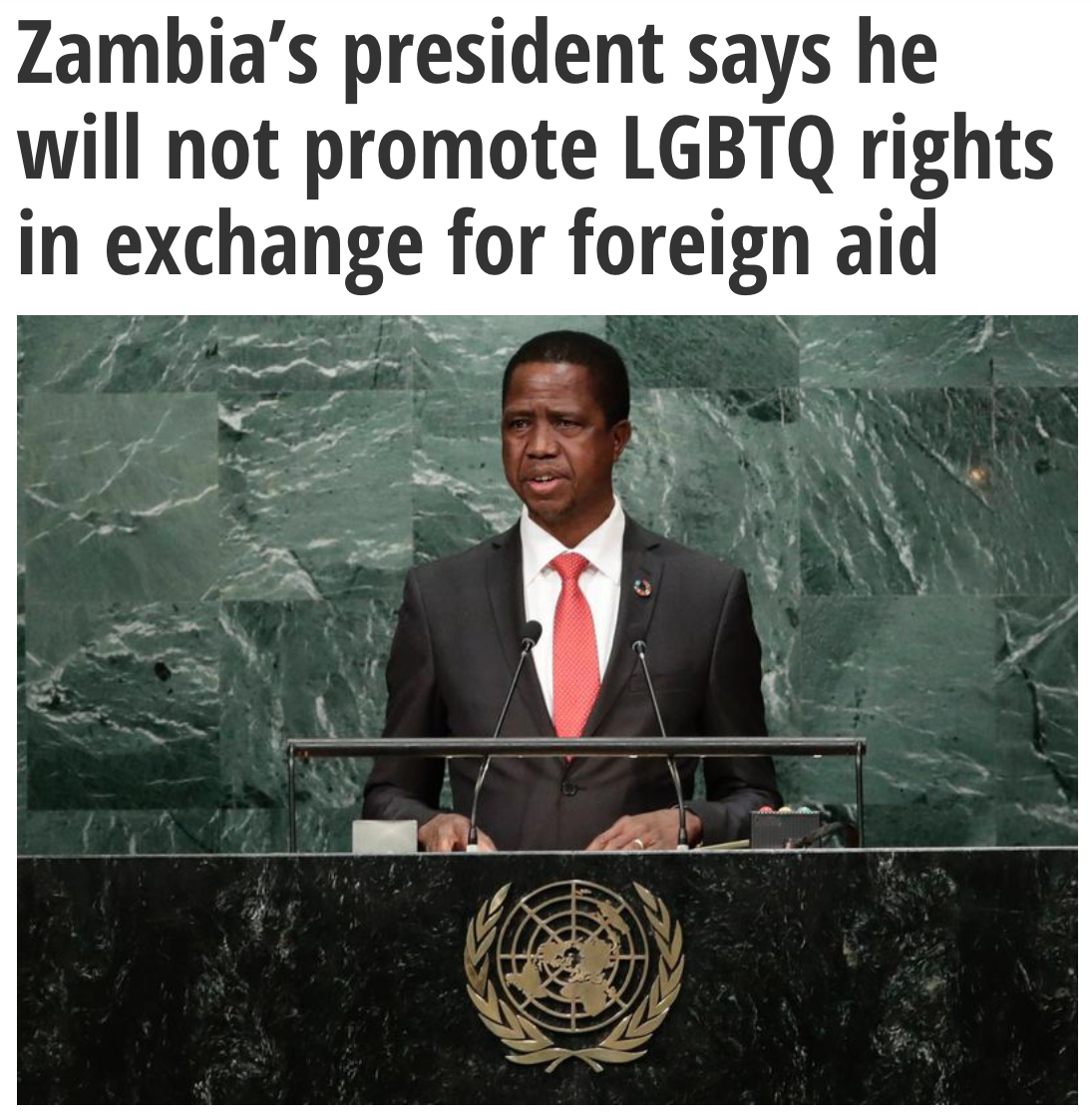 So far, the one country that has stood up against that is Zambia. Their president, Edgar Lungu, is a Christian – following the rules that white colonists first brought to his country – and he will not yield to gay anal.