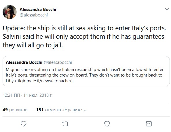 According to the Viminale (newspaper), every port has been closed to the tugboat, but the ministry of Transportation, guided by (Danilo) Toninelli could give the green light to the boat. But now there is an entirely new aspect to this story: The ship has transmitted an S.O.S in an area under the responsibility of the Libyan coast guard. The position of the Viminale has not changed, however, and for the moment the ship remains outside of our ports. The Italian coast guard – according to Salvini’s speech – can not replace the Libyan one, especially if the African colleagues have already entered into action.