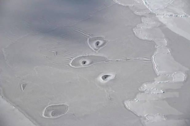 “We saw these sorta-circular features only for a few minutes today,” IceBridge mission scientist John Sonntag, the man who snapped the photo, wrote from the field. “I don’t recall seeing this sort of thing elsewhere.”