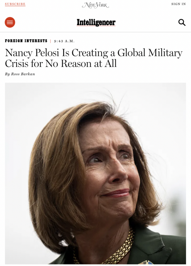 I’m a bit surprised Beijing didn’t send a team to intercept Pelosi’s flight. But I don’t know why I’m surprised. They have millions of different ways to punish the US for this ridiculous “Secret Invasion” fag-hag stunt.