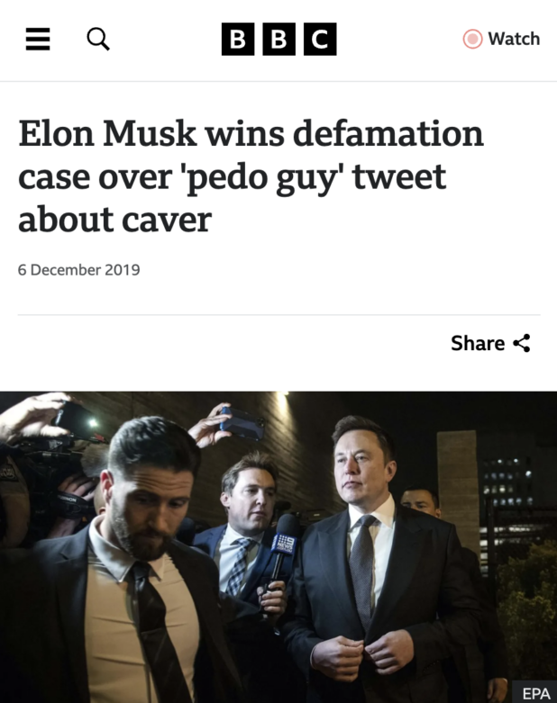 Remember when Elon sent that toy sub to Thailand to try to get the kids out of the cave, and the British diver in charge of the operation said it was useless? Elon responded by calling him a pedophile, then getting sued over it and losing.