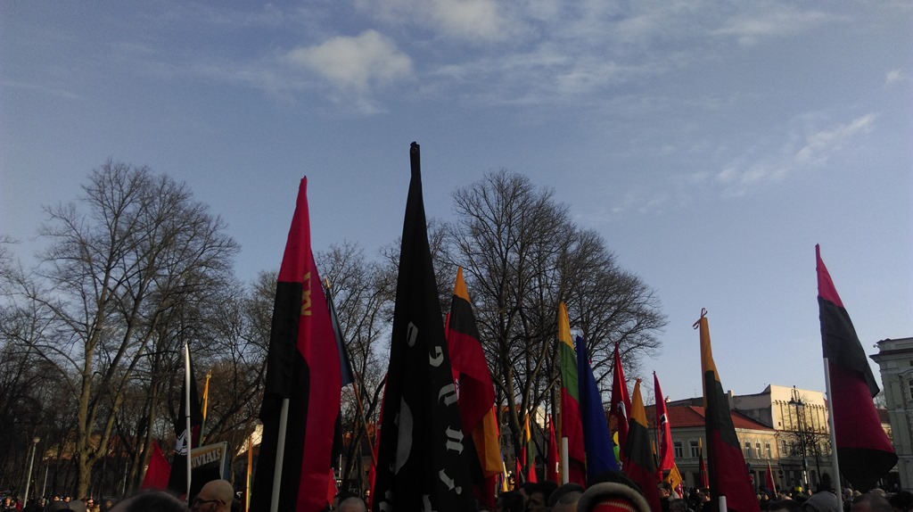 I noticed there was actually quite a strong Ukrainian theme at this year’s march, with dozens of Ukrainian flags and more commonly the Red/Black flags of the Banderists. The front banner for the march depicted the common struggle of the Anti-Soviet Partisans in Ukraine and the Baltic states, which successfully resisted the occupation into the 50’s and 60’s. Lithuanians were right to be proud as their bunkers in the swampland made base areas inaccessible to the Russians. On the march demonstrators would shout “SLAVA UKRAIN’E” (glory to Ukraine) in addition to “Lithuania for the Lithuanians”. It would appear that Russian intervention has inflamed fears and inspired a new level of consciousness in the entire region.