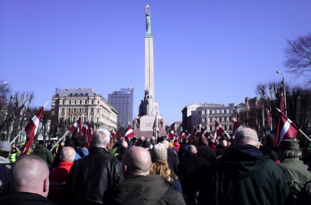 March 16th is Legion day – it marks the date when the 15th and 19th fought together for the first time, it is the only day of remembrance for Latvia’s only military conflict in living memory (It can be assumed there are no living veterans of the civil war, while 130,000 served in the legion, add to that relatives and you are talking about something that affected a significant portion of the population). The state cannot officially recognise Legion Day or hundreds of similar events that occur throughout the year, and clearly this has played right into the hands of the nationalists. National Alliance not only has political power, but they have been outsourced the task of reviving and moulding national consciousness. Even though it is a week day and most cannot take the time off, the event is growing, 3000 according to police estimates. The march takes place from where a church service was held to the freedom monument, where people pay their respects.