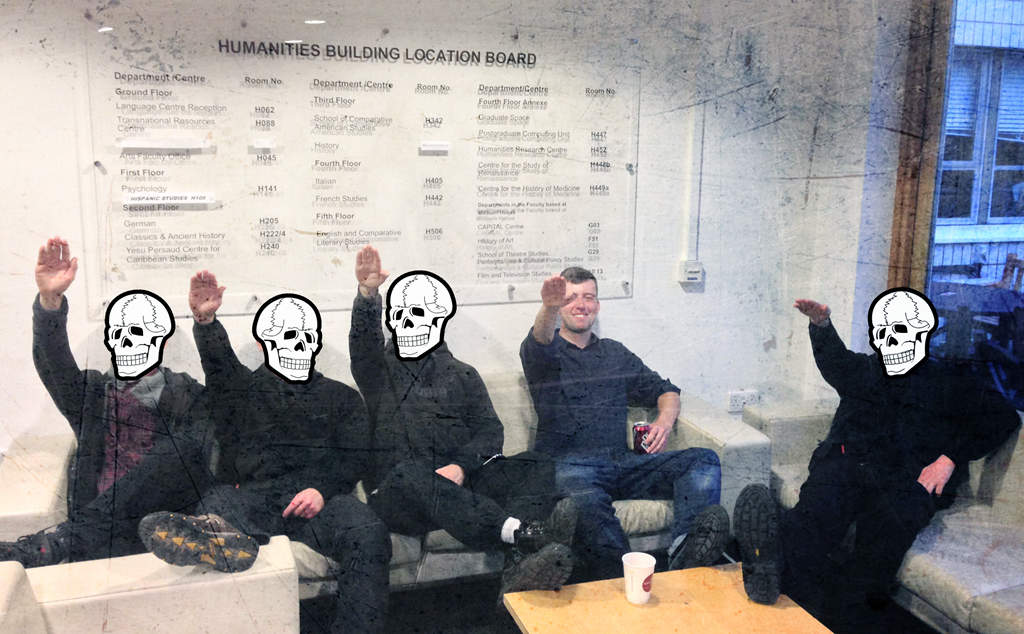 3 comrades who were scouting the area were accosted by plain clothes police officers who didn’t want us on campus – we took this to mean we should come back later when they would be gone. So instead National Action headed directly to Coventry University, where they were able to gain access to the main Student Union building even though it is supposed to be a secure site. Inside, they were able to run rampage – NA posters and leaflets were everywhere. Our youthful appearance and a partially true story that we were amateur film makers made this possible. Foreign students were told where they could go and our banner was unfurled from the top floor overlooking the main reception area.