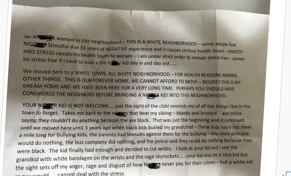 “NO N—–S wanted in this neighborhood,” the letter read in part. “THIS IS A WHITE NEIGHBORHOOD – some people find N—–S stressful due to 33 years of NEGATIVE experience [sic] and it causes serious health issues.”