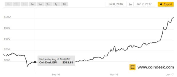Digital currency bitcoin kicked off the new year by jumping above $1,000 for the first time in three years late on Sunday, having outperformed all central-bank-issued currencies with a 125 percent climb in 2016.