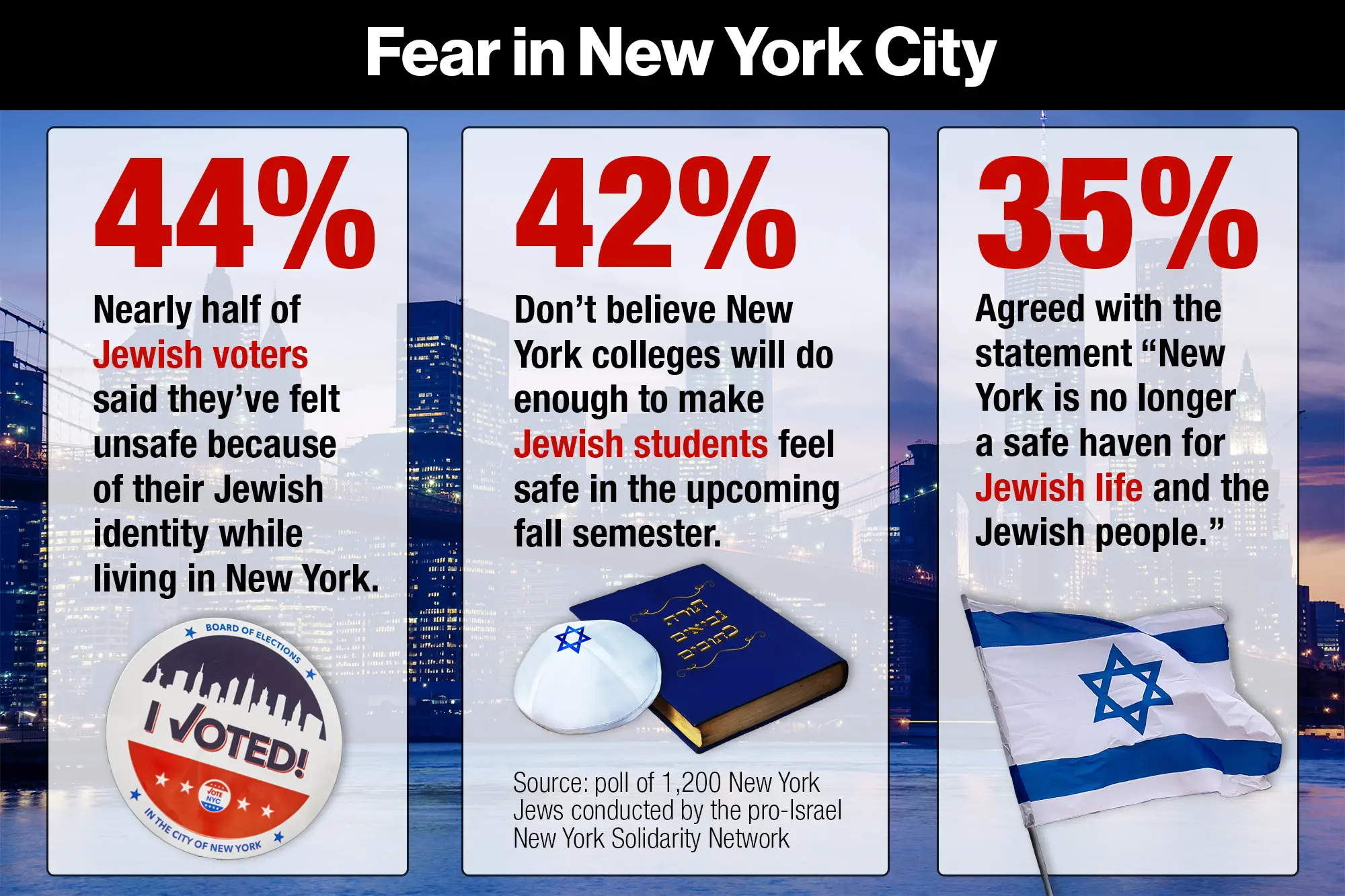 The survey conducted for the pro-Israel New York Solidarity Network found that 44% of the 1,200 Jewish voters in New York City and other counties queried said they have felt unsafe, as did 67% of identifiable Orthodox Jews.