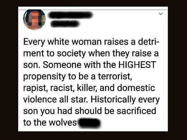“Every white woman raises a detriment to society when they raise a son. Someone with the HIGHEST propensity to be a terrorist, rapist, racist, killer, and domestic violence all star. Historically every son you had should be sacrificed to the wolves b___,” the tweet read.