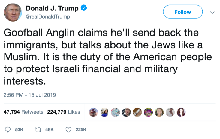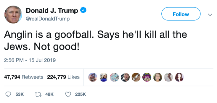 “Trump is already upping his hate game, as you can see with his recent statements about how all nonwhites should leave the country. If he can meet Anglin’s level of hate, he may be able to squeak out a victory in 2020,” Greenblatt concluded dismally.