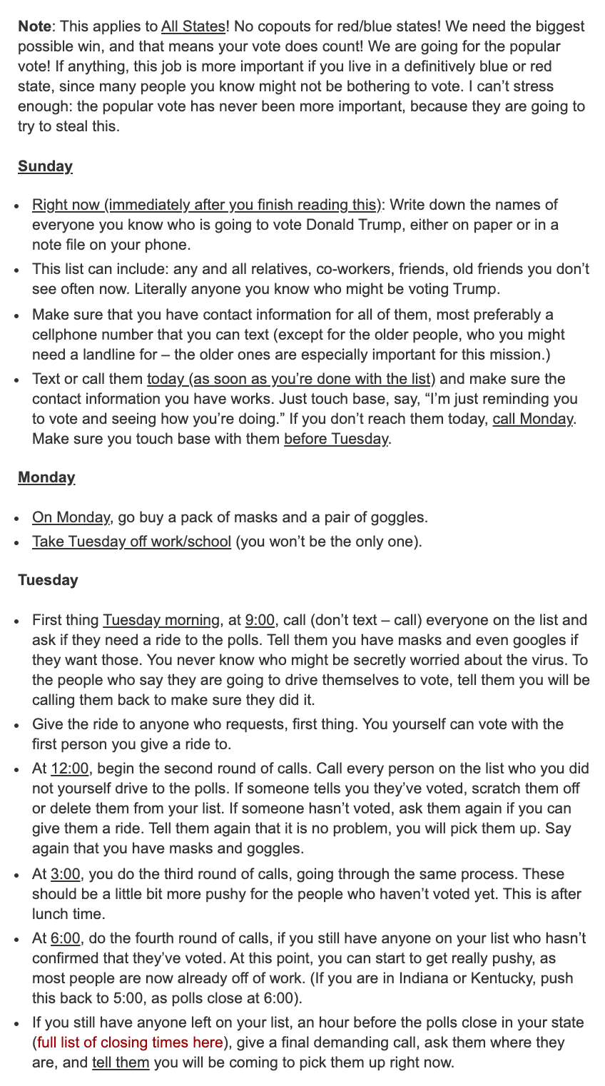 Note: This applies to all states! No copouts for red/blue states! We need the biggest possible win, and that means your vote does count! We are going for the popular vote! If anything, this job is more important if you live in a definitively blue or red state, since many people you know might not be bothering to vote. I can’t stress enough: the popular vote has never been more important, because they are going to try to steal this.