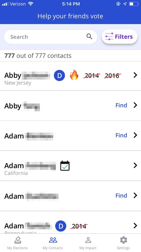 Not unlike Voice Roulette, Vote With Me is a new service that bills itself as one thing, when the reality of its application is a much more insidious. Described on its “about me page” as a mobile app that “uses your personal network to help you get out the vote,” what Vote With Me actually does is link the names and phone numbers in your phone’s contact list with state voter polls.