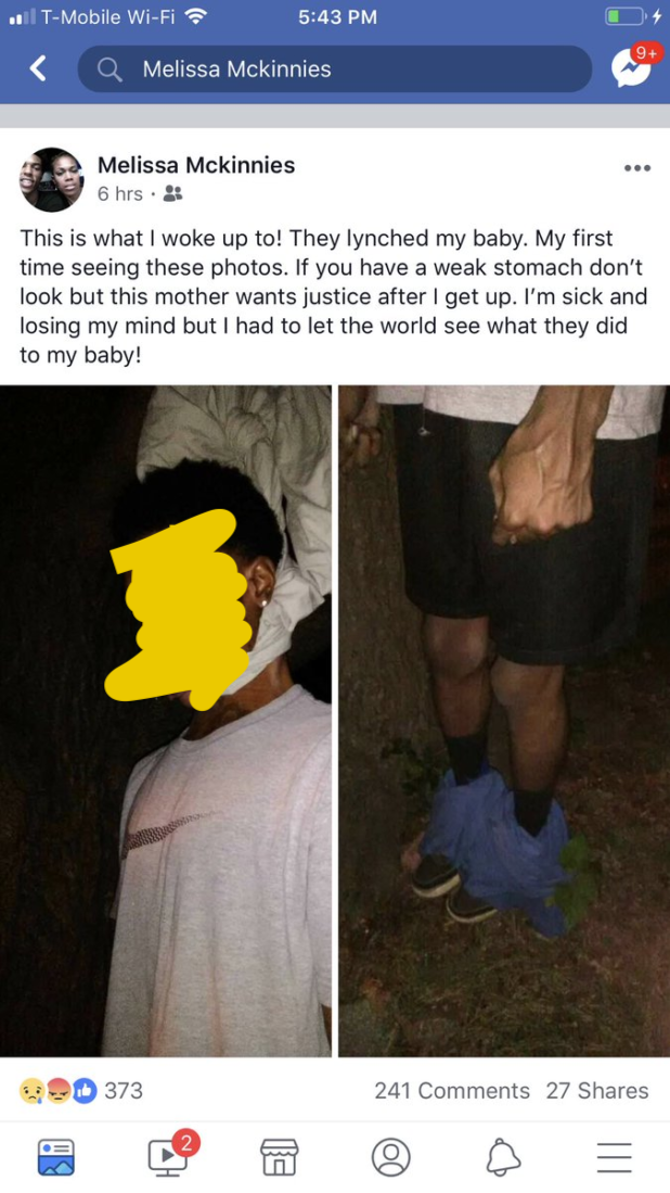 The posting showed pictures of McKinnies’ son hanging from what appeared to be bed sheets.