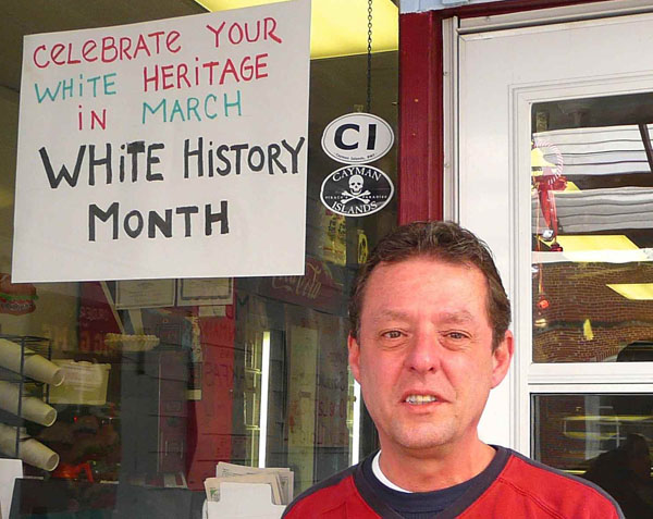 His sign reads: “CELEBRATE YOUR WHITE HERITAGE IN MARCH, WHITE HISTORY MONTH”