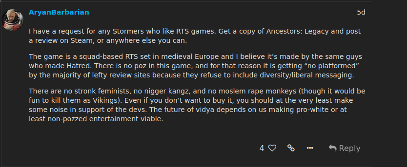 In any case, if you’re a fan of RTS games and want a European historical experience free from Jew bullshit, I recommend you give Ancestor’s Legacy a try.