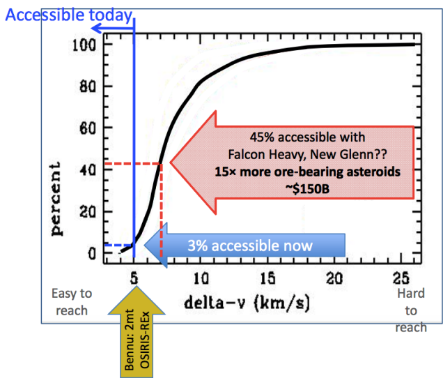 But, he said at the AAAS meeting, the Falcon Heavy could increase that delta-v by just a few kilometers per second—a change that could potentially let miners access 45 percent of these more valuable asteroids.