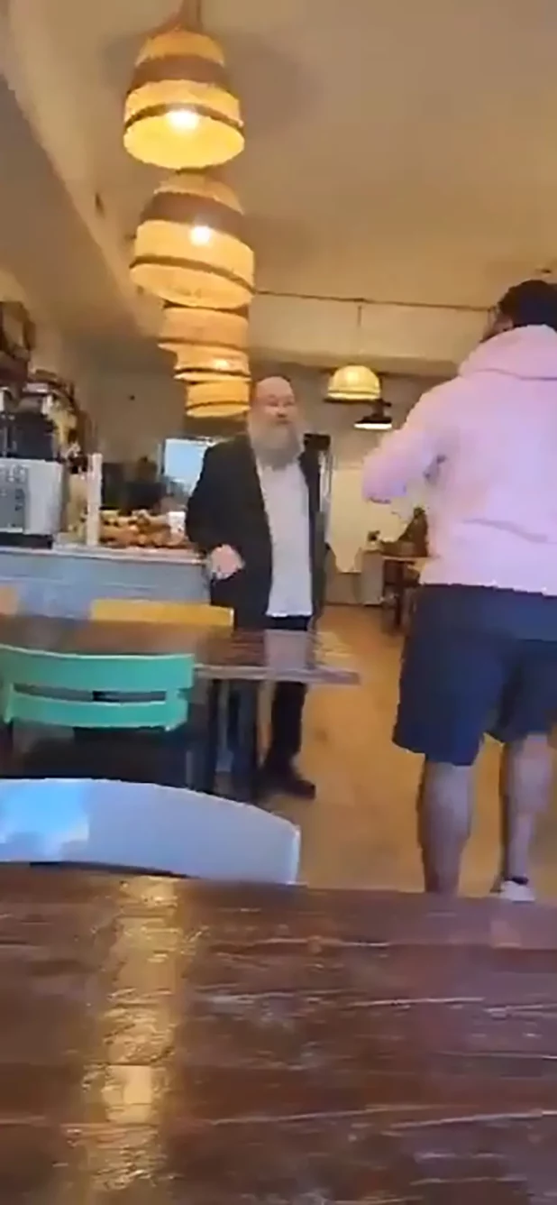 The footage, shot inside the Almah cafe, along Utica Avenue, shows the moment a man dressed in a pink hoodie confronts a customer on Thursday morning, demanding he give his opinion on the war in Gaza.