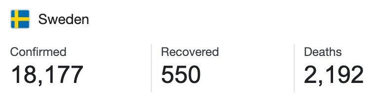 Sweden is a country of 10,230,000. They have had a total of 2,192 deaths from coronavirus.