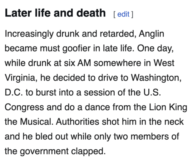 I’m not going to do it. I don’t want to hear about “Anglin threatens the US Congress with Lion King dance.”