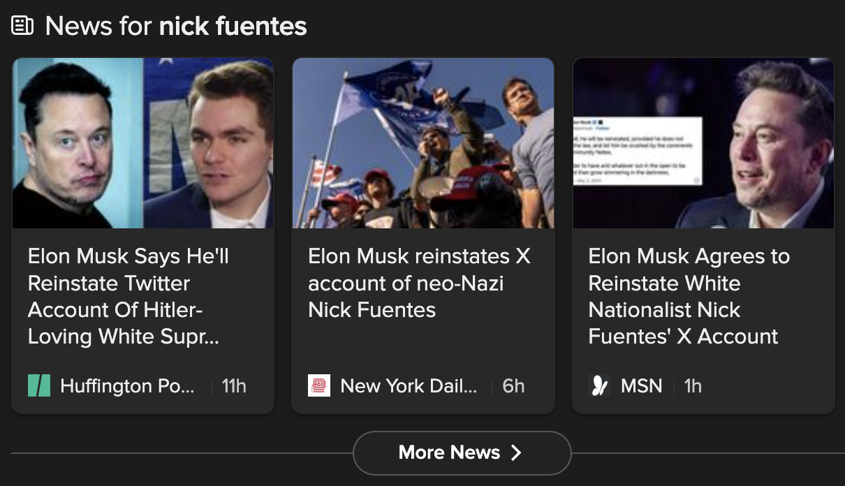 Nick Fuentes uses all of our talking points. After Elon took over, he was briefly reinstated on Twitter and said “we love Hitler” – at least semi-ironically, as a reference to Kanye saying that – and was immediately banned. This is after yonder yipper said no one would get banned for legal speech.