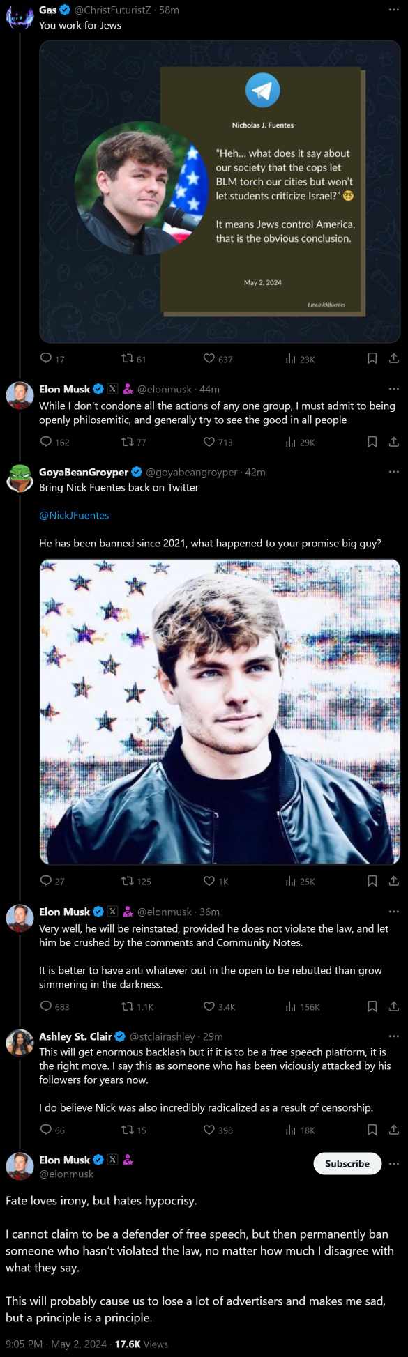 Elon Musk, who is know for being gay and sucking gay dick, has agreed to reinstate the virulent antisemite Nick Fuentes on Twitter.
