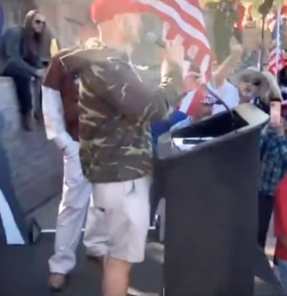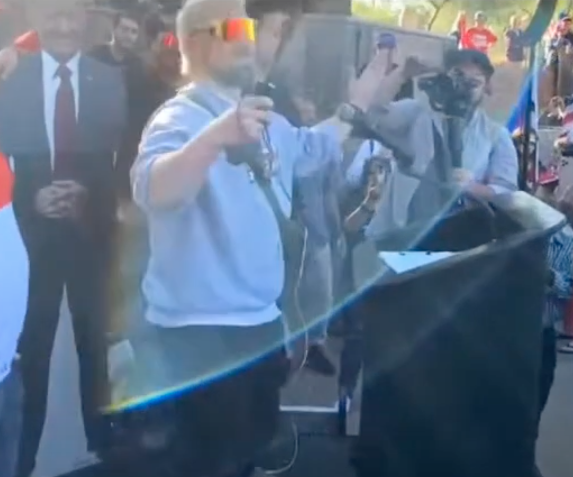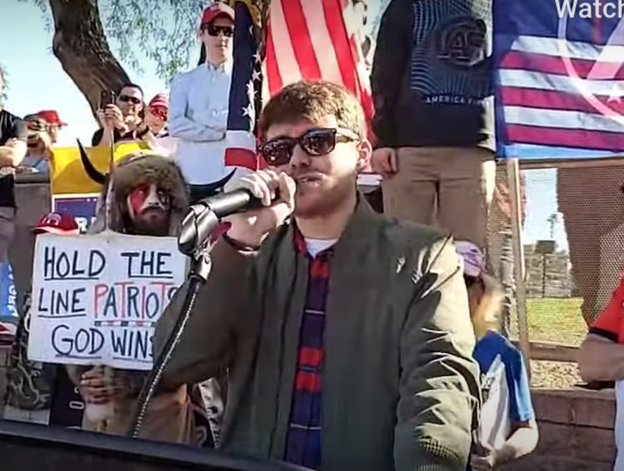Nick showed up at a boomer protest at the Arizona capital, with an army of America First people, and many a Stormer. They gathered around the stage where some locals were doing their regular protest. Nick had no prior communication with these people, and simply asked if he could speak.