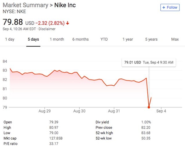 In addition, Nike’s current growth is coming from markets that simply don’t care about whether football players take a knee during the U.S. anthem. Nike’s U.S. revenue in the last quarter fell 5% in the last nine months. This was well before it took a side in the kneeling debate. At the same time, it grew 8% in Latin America, 13% in Europe, and 16% in China. Consumers in these companies may know about who kneels in American football, but few will care.