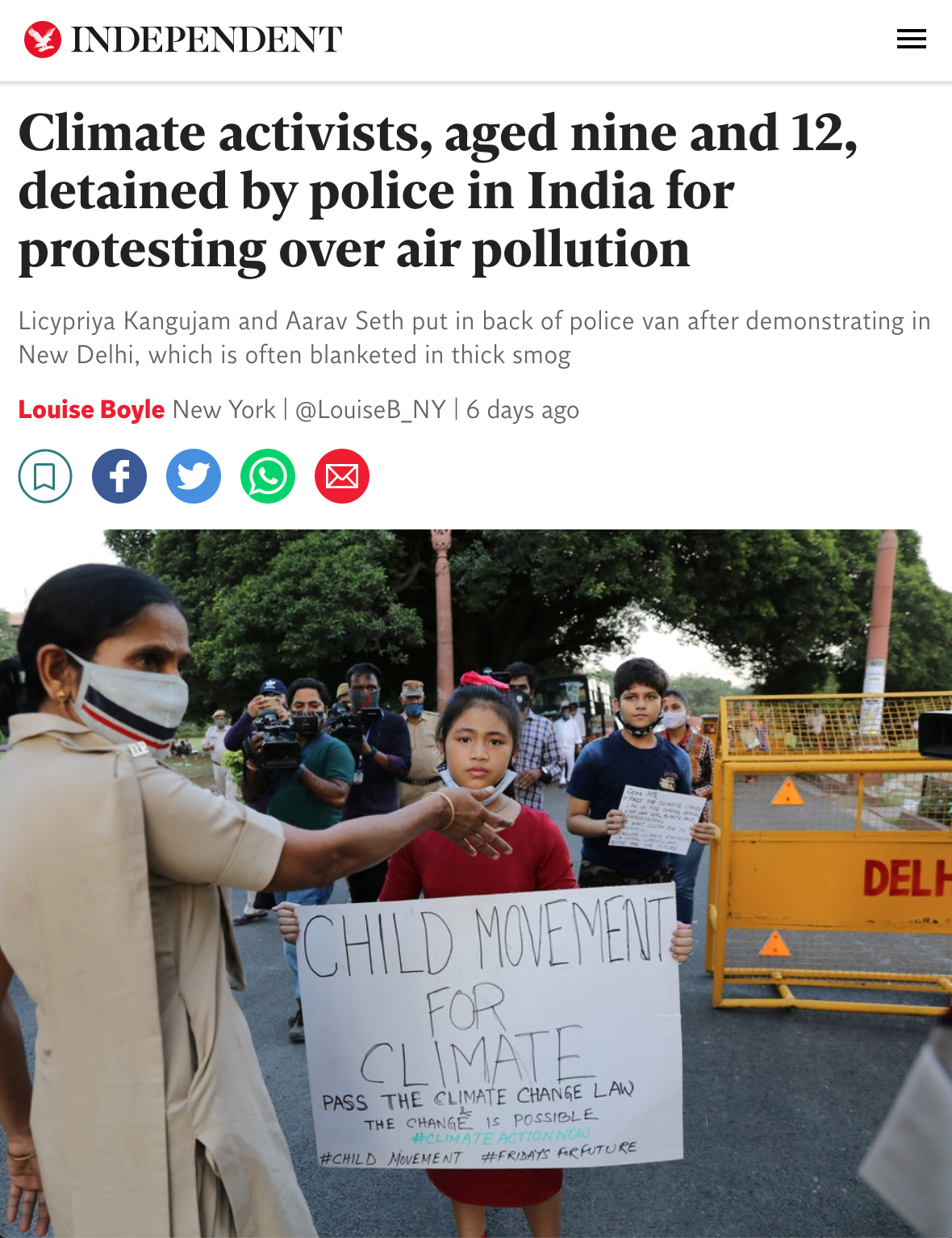 Licypriya Kangujam, and fellow activist Aarav Seth, aged 12, were picked up by officers at the weekend after protesting about air pollution outside the Parliament House in the capital. New Delhi has among the worst air quality in the world and the city is often blanketed in thick smog.