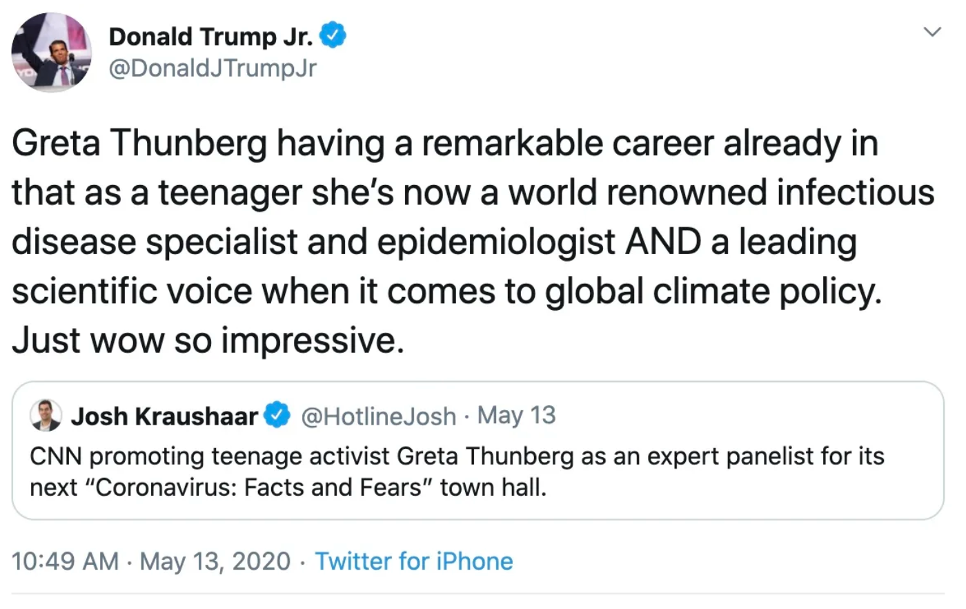 Then the media started using her as a messenger for coronavirus. CNN put the prophet Greta on an “expert panel” on coronavirus.