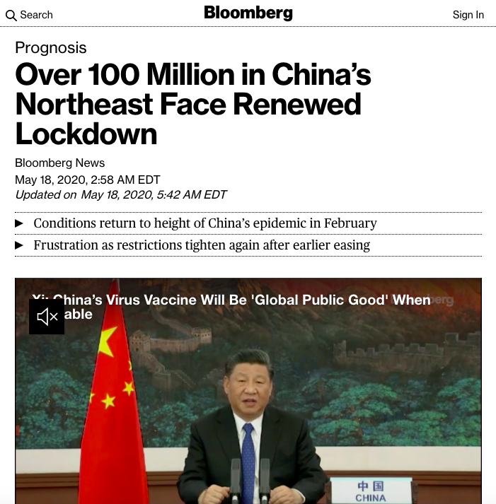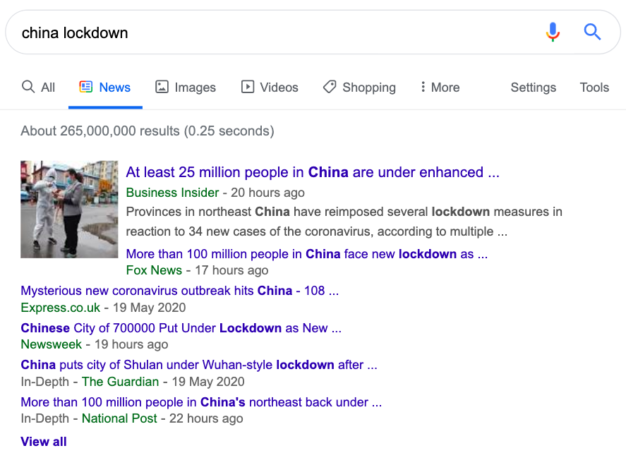 Indeed, neither Xinhua nor the China Daily, official government news sources, are dedicating headline space to this story. Xinhua reported on the Shulan city lockdown on May 18.