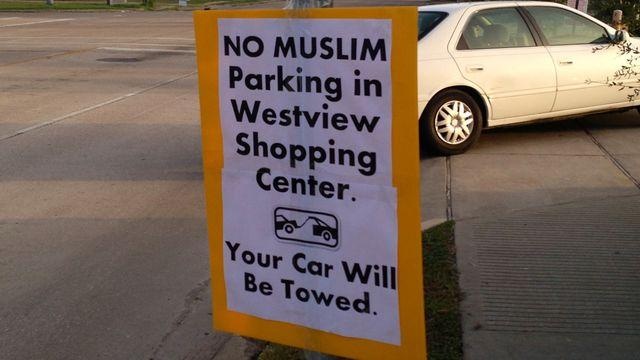 In black letters, the signs read, “No Muslim parking in the Westview Shopping Center. Your car will be towed.”