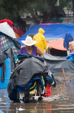 Caravan migrants in Mexico fill new border shelter after rains force exodus.