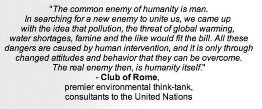 You can also just go on the WEF YouTube channel and watch their forums, where they discuss this stuff openly. There are many other think tanks discussing this. You can go all the way back to the Club of Rome in the 1970s, talking about manufacturing crises, and all the way back to the turn of the 20th century and then the formation of the League of Nations to see a plan for a global government run by an elite minority. Population reduction is a huge part of this.